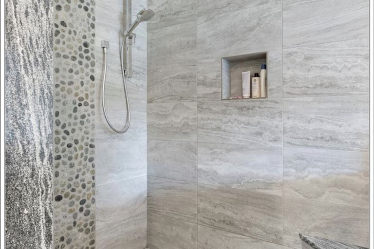 Substrate readiness: flat, clean, and suitable for bonding. For floors, ANSI flatness tolerances matter—large-format tile demands it. Pro waterproofing: walls, corners, and niches are sealed; the shower pan is sloped and tested. Planned layout: laser lines, centered or balanced cuts, aligned grout joints through niches and edges. Right materials: porcelain or stone chosen for the space, correct trim profiles, slip-resistant mosaics where needed. Clean finishes: consistent grout color, smooth tool lines, caulk (not grout) at movement joints, tidy transitions to other floors.